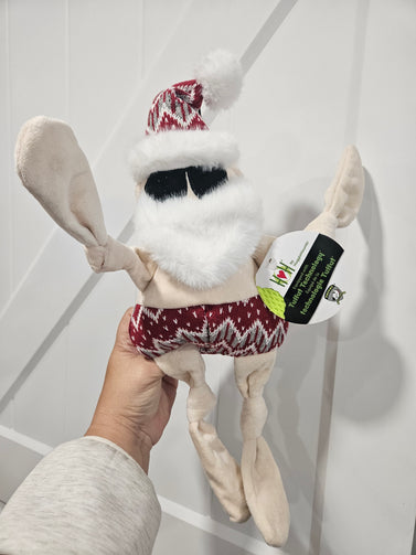 He’s traded in his sleigh for sandals and is catching rays where the beach meets the North Pole! Say hello to Beach Bum Santa, the jolliest vacationer you’ve ever seen—complete with festive swim trunks, shades, and tropical vibes. Part of our original HuggleGroup™ Knotties® collection, this sun-loving Santa is packed with durable fun and squeaky surprises. Built with our signature Tuffut Technology® and five squeakers, he’s ready for tugging, tossing, and plenty of sandy snuggles this holiday season.