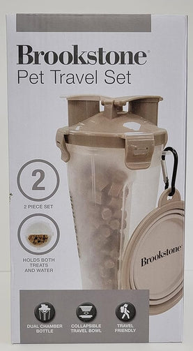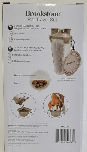 2 piece pet travel set comes with collapsing bowl and clip to hang on bottle with plastic double spout lid. One side for water and other side for food. Clear container. Dishwasher safe. BPA-free plastic. Bottle is 4" W x 9" H. Bowl is 5 1/4" W x 2 1/4" H, collapses to 1/2" H.