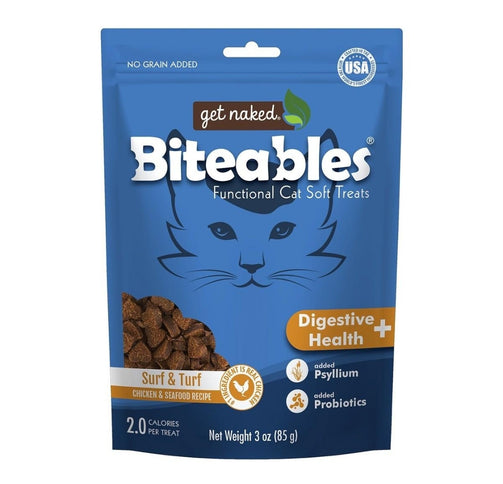 Get Naked Biteables Digestive Health Plus Soft Cat Treats are a su-purr simple way to support your furbaby’s digestive health. They feature psyllium for fiber to support regular digestive flow, while natural probiotics support gut and digestive health. The surf-and-turf recipe features tasty chicken and seafood flavors to encourage your kitty to eat up every treat. These all-natural treats are free of gluten, grain and dairy.